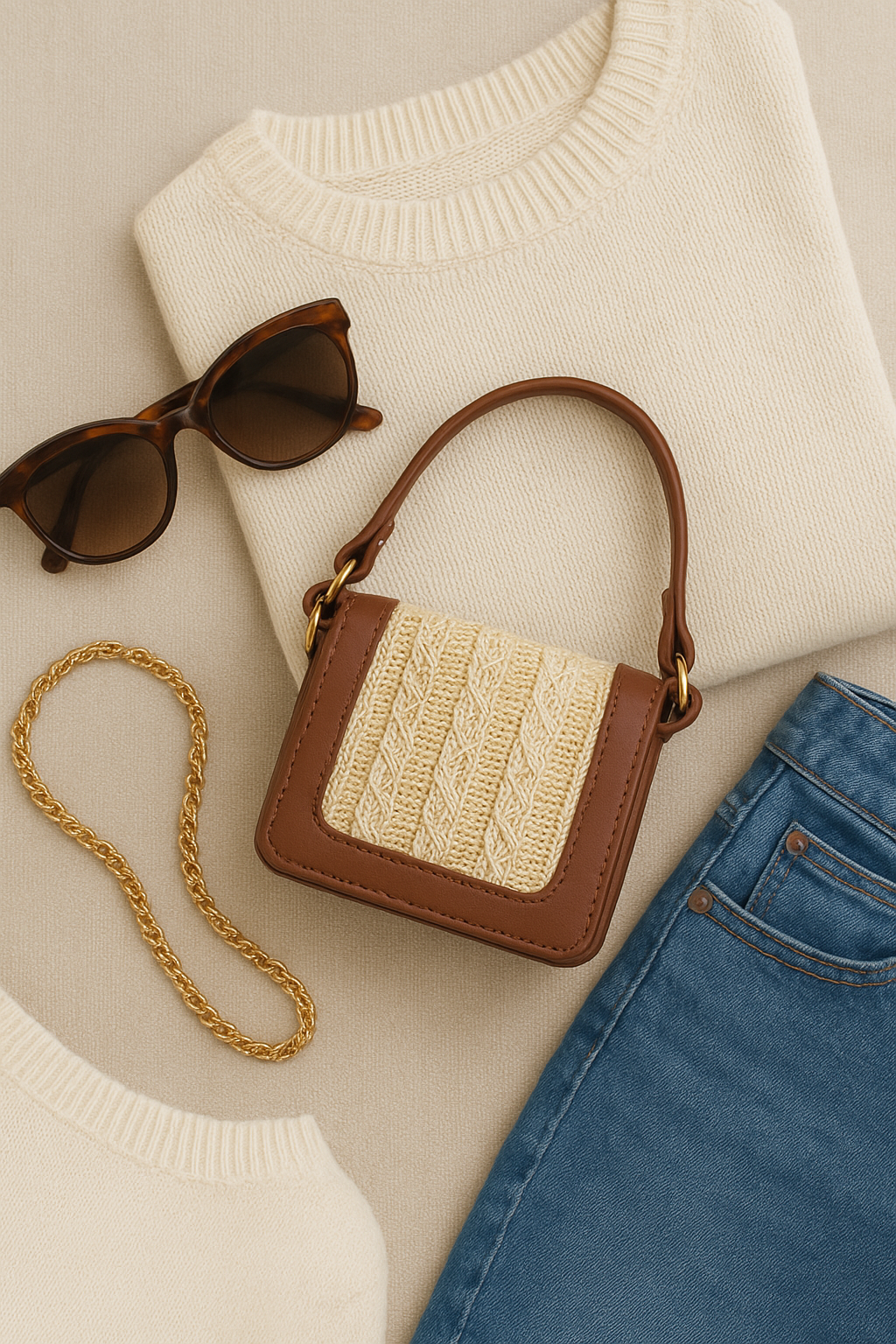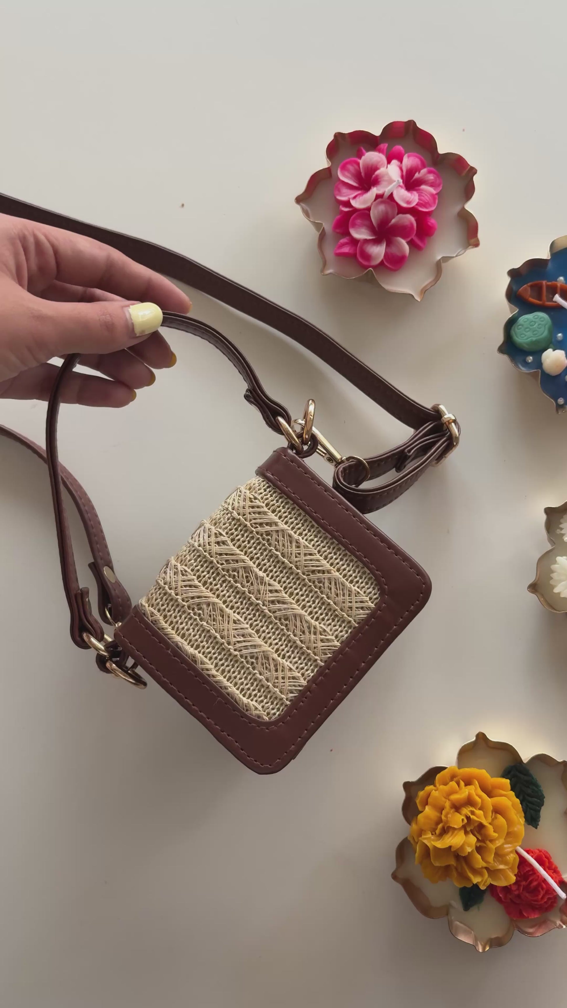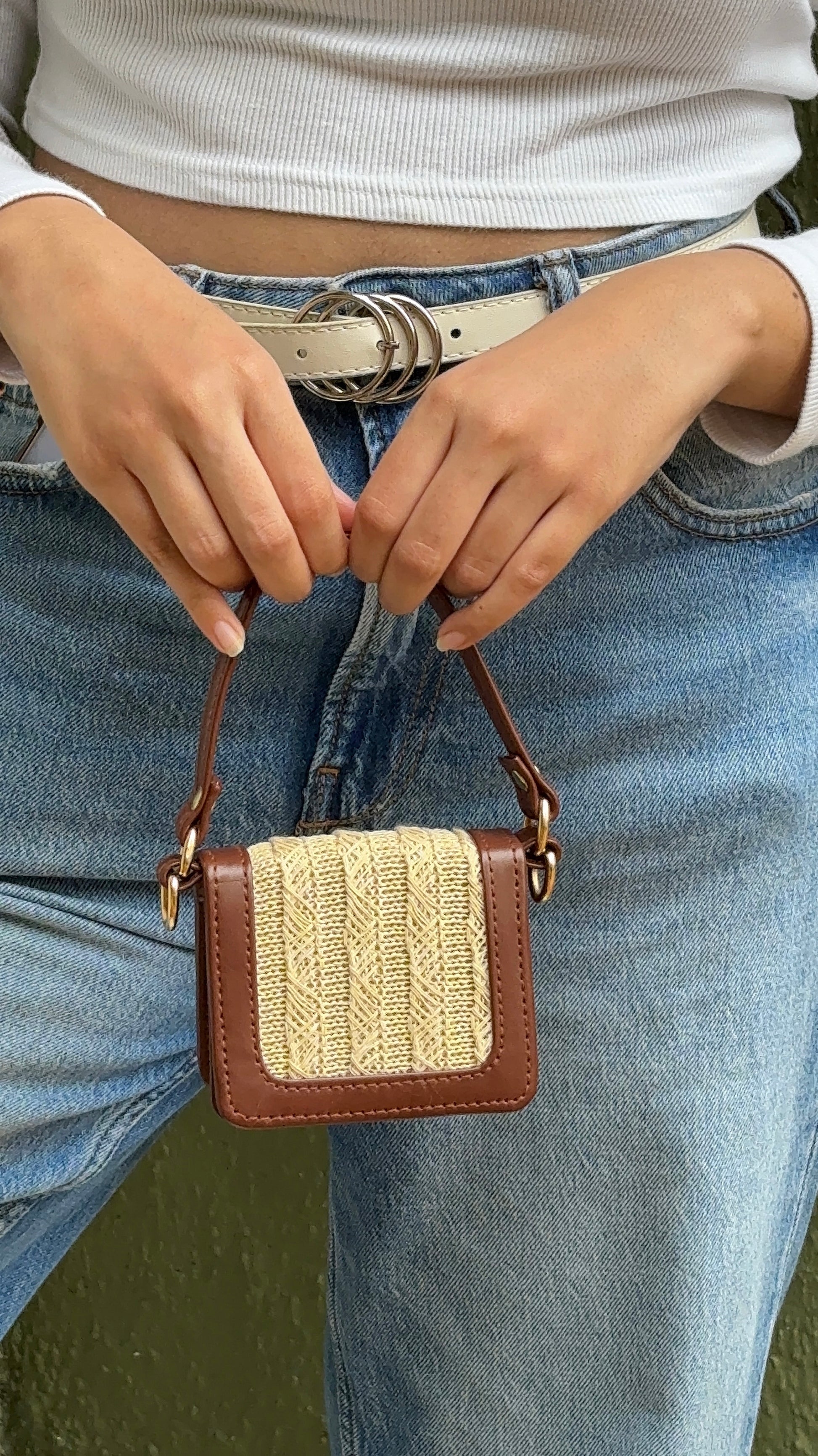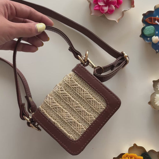 • Mini bag with brown leather trim and woven straw front panel